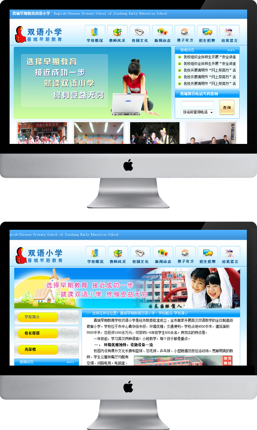 晉城早期教育學(xué)校雙語小學(xué)是經(jīng)市教委批準(zhǔn)成立、全市首家開展英漢雙語教學(xué)的全日制高級寄宿小學(xué)。學(xué)校位于市中心黃華街中段,環(huán)境優(yōu)雅,交通便利。學(xué)校占地4500平米,建筑面積5500平米,總投資1000余萬元,可容納1-6年級學(xué)生600余名。其突出的特點是: