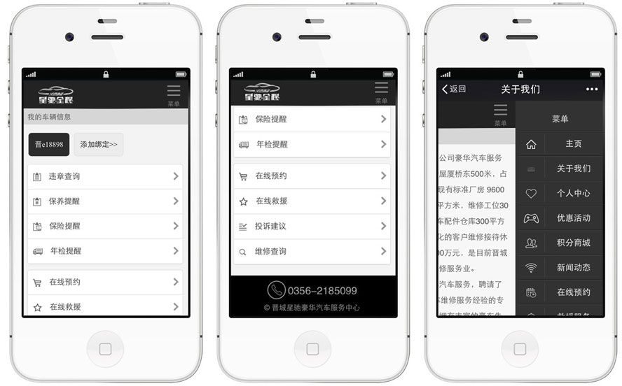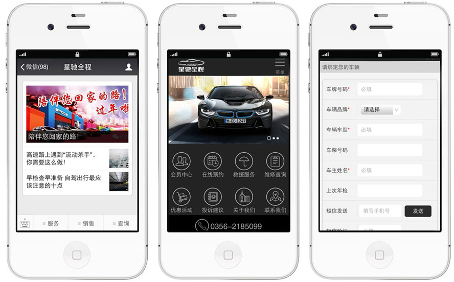本項目基于騰訊的微信平臺,除實現(xiàn)了常規(guī)第三方公眾平臺具有的自定義互動導航菜單、關(guān)健詞應答、微網(wǎng)站、微商城預訂、微信支付、微信會員卡、營銷活動、微信游戲等功能外,項目最大的亮點是通過定制開發(fā)實現(xiàn)了與目前星馳全程內(nèi)部業(yè)務(wù)系統(tǒng)進行數(shù)據(jù)交互,在線提供實時的積分查詢、積分兌換、車輛維修進度查詢、保險到期查詢、保養(yǎng)狀態(tài)查詢等功能。